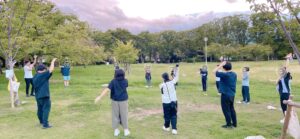 ▲塾生たちと公園で体操しているようす